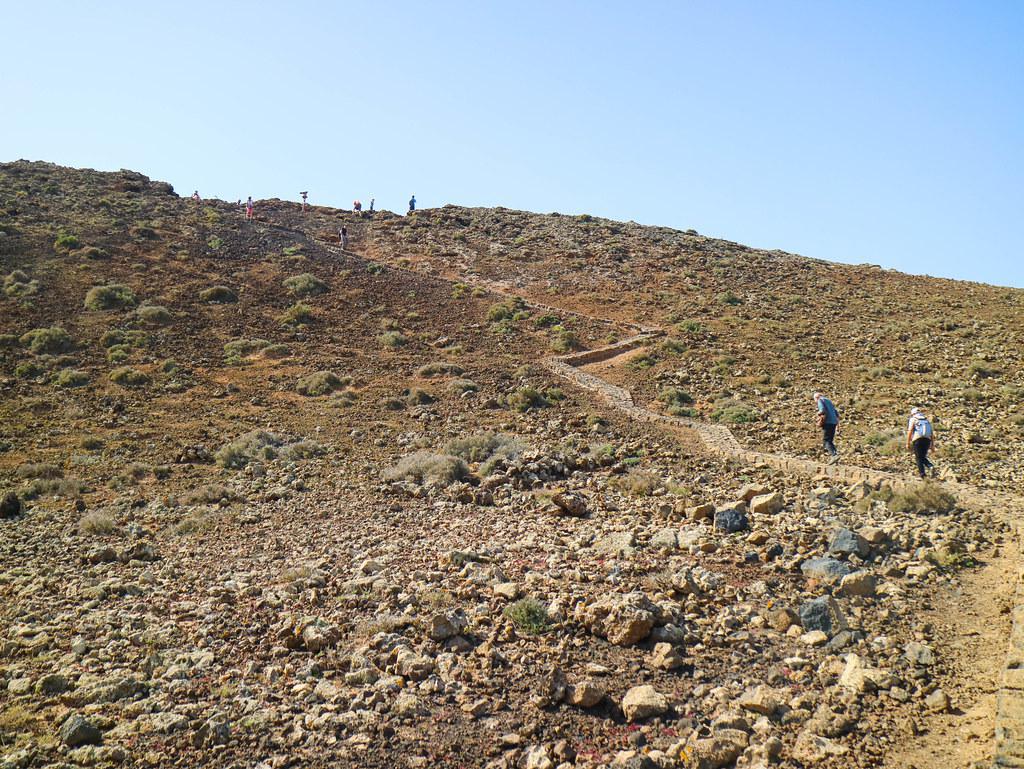 ¿Cómo llegar? Al llegar a Lajares localizamos una rotonda junto al campo de fútbol. A la derecha seguimos en dirección a Majanicho por la calle La Cancela hasta ver unos camellos apostados en la cuneta (es posible dar un paseo sobre ellos). Allí unos carteles indican el inicio del sendero. Aparcamos y comenzamos la ruta. Hay dos senderos, el GR-131 que cruza la isla -y que en este punto te lleva hasta Corralejo- y el sendero local FV-2 que es el que tomamos.